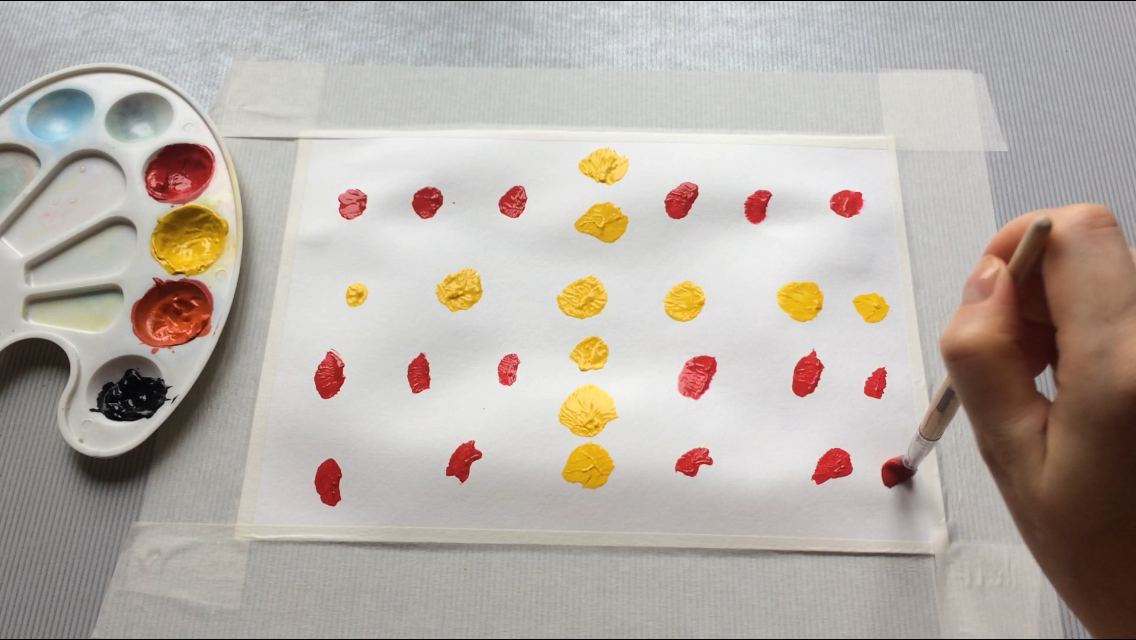 Наносим точки желтой краской так, чтобы они шли вдоль и поперек. Остальное пространство заполняем точками алой краски. Все это вдумчиво, получая удовольствие, размазываем по бумаге.