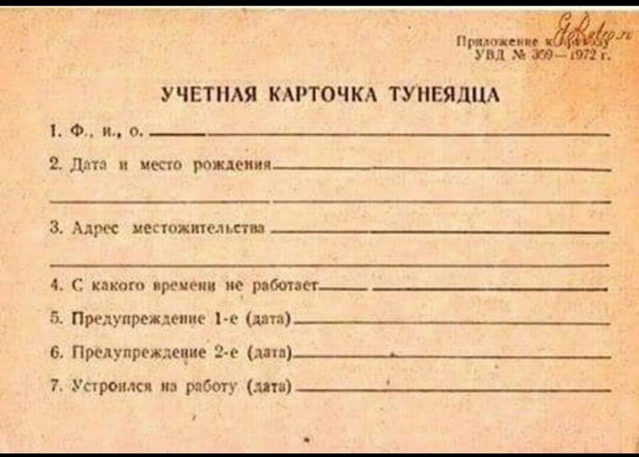 Сейчас оно совсем не в обиходе, а 30 лет назад "Тунеядство" это была статья уголовного кодекса.209 статья УК РСФСР, до двух лет лишения свободы. Ну это лишь в том случае, если та карточка, что в начале поста, полностью заполнена будет.