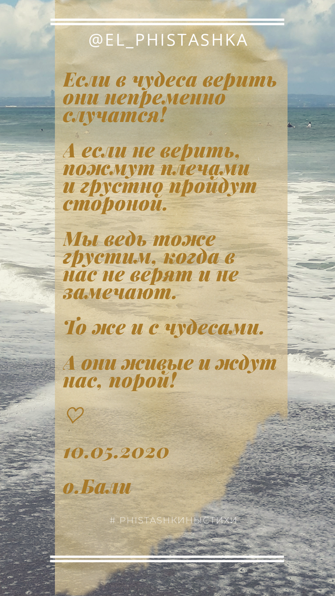☯️Если в чудеса верить - они непременно случатся!А если не верить, пожмут плечами и грустно пройдут стороной.Мы ведь тоже грустим, когда в нас не верят и не замечают.То же и с чудесами.А они живые и ждут нас, порой!♡10.05.2020о.Бали