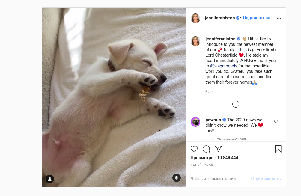 Судя по инстаграму, у Джен новая пара. С двойным комплектом ног. Звезда «Друзей» выложила видео со своим новым щенком. Зовут Честерфилд. Это уже третий пёс Эннистон: у нее есть еще шнауцер Клайд и питбуль Софи. Собак Джен в основном подбирает через приюты, так что этот пес не только новый друг и магнит для лайков, но и плюс в карму. Поздравляем!