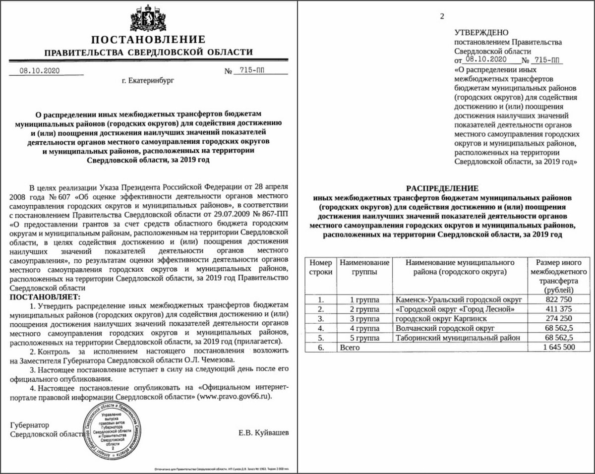 За эффективную работу местного самоуправления городские округа Каменск-Уральский, город Лесной, Карпинск, Волчанский и Таборинский муниципальный район получили гранты Правительства Свердловской области. Суммы грантов утверждены 8 октября на заседании Правительства области и составили: для Каменск-Уральского городского округа – 823 тысячи рублей, города Лесной – 411 тысяч рублей, городского округа Карпинск – 274 тысячи рублей. Волчанский городской округ и Таборинский муниципальный район получат по 68 тысяч рублей.
