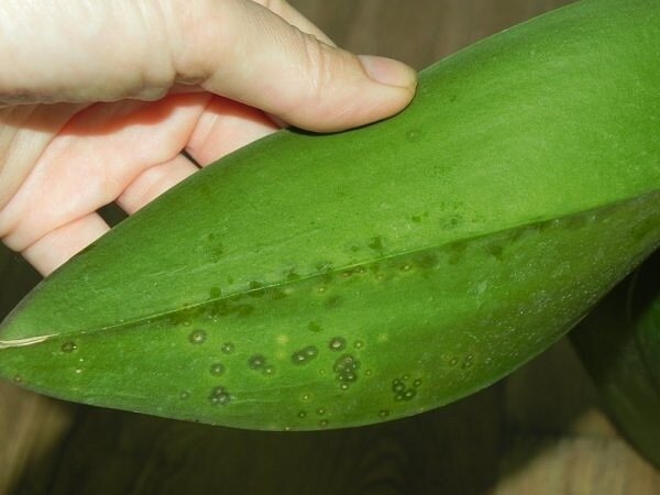 Первый, наиболее распространенный, если Вы боитесь качественно и вовремя поливать орхидею. Что при этом происходит? Нуждающаяся в поливе орхидея начинает очень быстро поглощать воду при поливе, настолько быстро, что не успевает постепенно распределять влагу по клеткам, в одних местах появляется больше влаги, чем в других. Получаются бугорки, в некоторых случаях вдавленные точки.