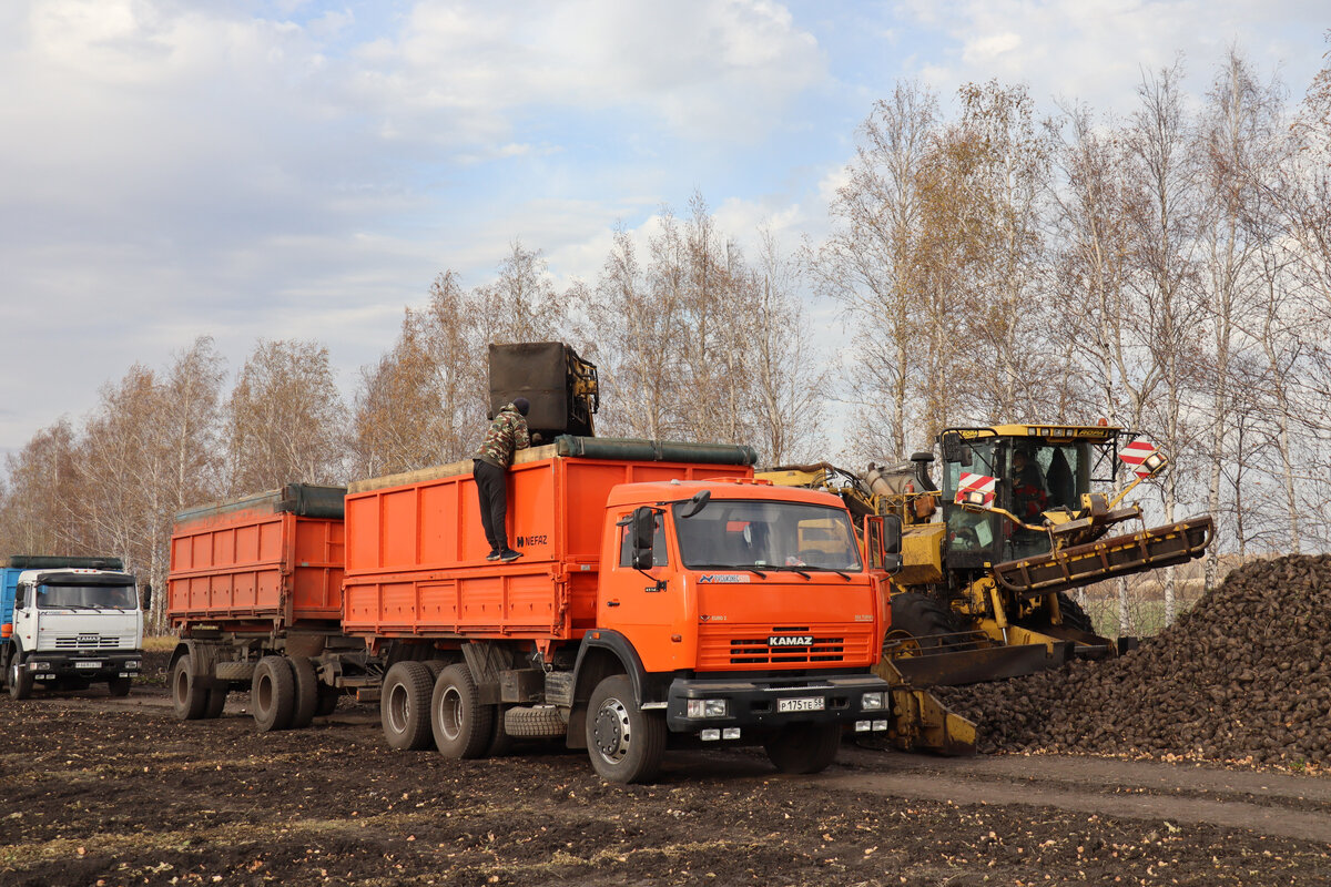Сейчас не менее напряженная пора. Механизаторы работают по 12 часов, после чего их сменяют напарники, обед и ужин привозят прямо в поле. Тем, кто остается в ночь, еще и сухпайки выдают. Водители большегрузов отдыхают урывками, успевают кемарнуть, пока ждут своей очереди на погрузку. В сутки вывозится примерно 1400-1500 тонн корней, каждый КАМаз успевает сделать два рейса, иногда больше.