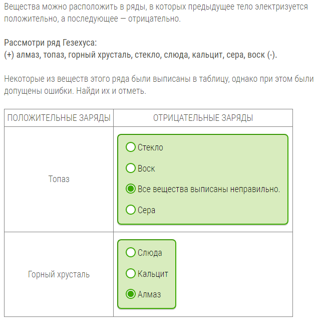 Встретил я тут в онлайн-тестах очередное забавное задание. Сначала расскажу о чём речь. В электростатике есть понятие электризации. Есть явление электризации трением: если потереть два предмета друг о друга, то один зарядится положительно, второй отрицательно (трибоэлектричество). Вещества располагают в ряды, по знаку заряда, который образуется при трении (типа ряда электроотрицательности в химии). По такому ряду можно определить, какой заряд образуется у тел: то, что левее в ряду, будет заряжено положительно, а которое правее - отрицательно. И вот задание: Я не сразу въехал в смысл. Задание сформулировано ещё сложнее, чем я пишу свои статьи. А когда въехал я сильно удивился. Поясню: надо выделить ошибки в таблице. Во второй строке ничего необычного, там действительно только алмаз будет иметь положительный заряд, если его тереть о горный хрусталь. Но в первой строке... Там нечего выбрать (на первый взгляд). Все вещества, которые перечислены будут заряжены отрицательно, если тереть
