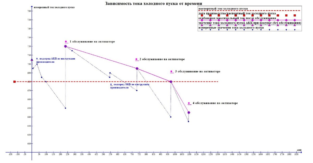 · Обслуживание АКБ активатором восстанавливало емкость до первоначального значения в течение 735 суток со дня приобретения (857 суток со дня производства)