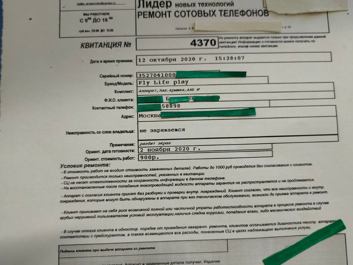 Очередной "клиент", представился как командированный и ВС РФ и проездом из Москвы, некий Б.П. Первоначально обращение было заменить АКБ на телефоне Fly Life Play. При ближайшем рассмотрении было выявлено, что неисправен разъем зарядки, о чем я успешно и уведомил некоего Б.П. Все удовольствие 900 р по стоимости - замена разъема USB. О том, собственно, и составили квитанцию.