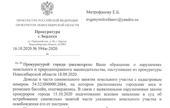 Отличная идея построить бассейн на территории городского леса Бердска. Вопрос к бердскому прокурору - почему иск был подан только после обращения?