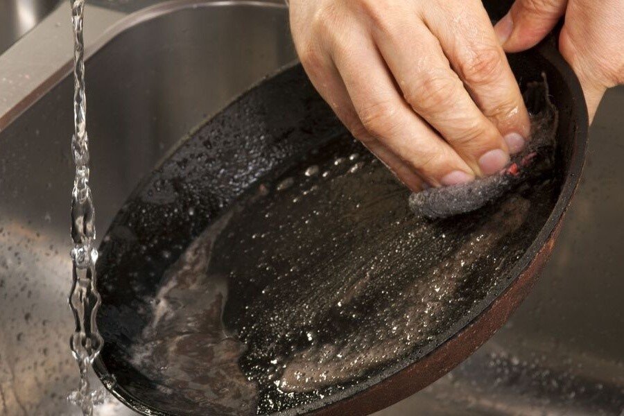 После того как готовка была окончена, сковородке необходимо дать остыть. Нельзя подставлять посуду под струю ледяной воды, чтобы она быстрее охладилась. После остывания сковороду очищают мягкой губкой с использованием теплой воды. Если на поверхности посуды осталось только масло после жарки, ее можно вытереть бумажной салфеткой без использования моющих средств и воды.