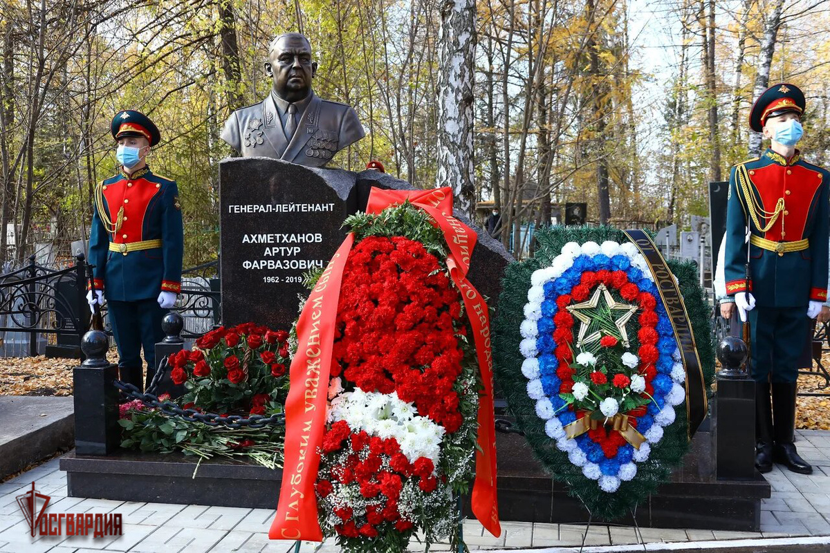 На мусульманском кладбище Уфы состоялось открытие памятника генерал-лейтенанту полиции Артуру Ахметханову, в 2016-2018 годах исполнявшему обязанности заместителя командующего Приволжским округом Росгвардии по организации вневедомственной охраны и лицензионно-разрешительной работы. В церемонии приняли участие глава Башкортостана Радий Хабиров и командующий Приволжским округом войск национальной гвардии генерал-полковник Александр Порядин.