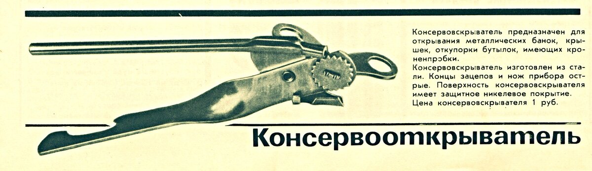 В СССР выходил ежемесячный журнал, который знакомил читателей с товарами-новинками. Сообщалось, например, планируемое количество годового выпуска какой-нибудь продукции. Знакомили читателей и с импортными товарами, и с новинками бытовой техники и электроники. И вот ровно 50 лет назад в сентябре 1970-го года всем был представлен консервооткрыватель. Изготовлен из стали, имеет защитное никелевое покрытие, стоит 1 рубль.