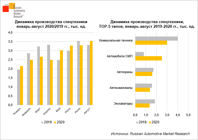 По данным Russian Automotive Market Research, за январь-август 2020 г. в России выпущено 22,9 тыс. ед. спецтехники, что на 3% меньше результата января-августа 2019 г.