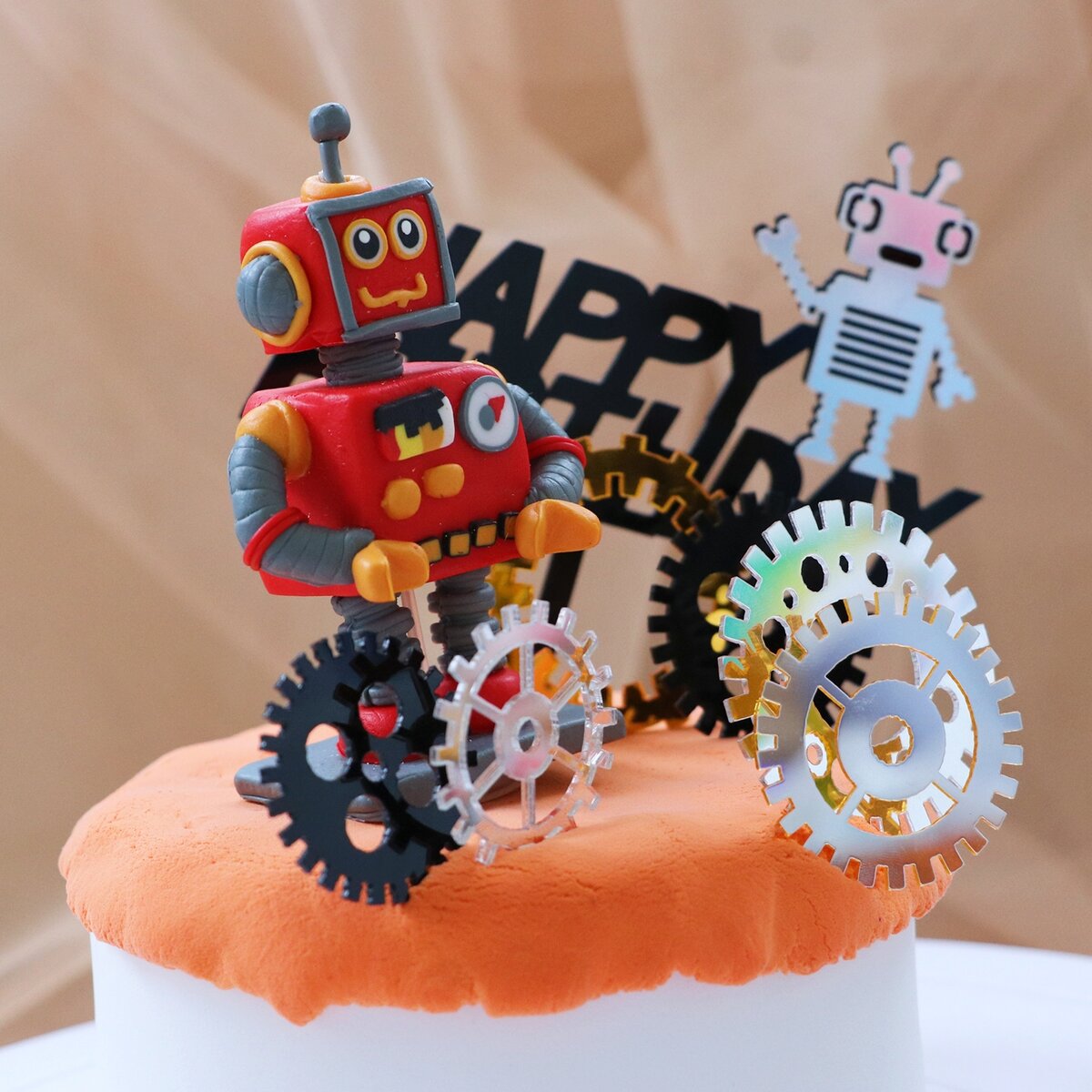 Классный топер "С Днём рождения". Он выдержан в общем стиле робототехники. Топер пластиковый, лёгкий, устойчивый. Отдельно по клеивается серебряный робот. Ножка не съёмная. Для украшения кондитерского изделия дополнительно взяла пластиковые шестиренки. Каждая шестиренки была в защитной пленке с обеих сторон. В комплекте 6 шт. различного размера.