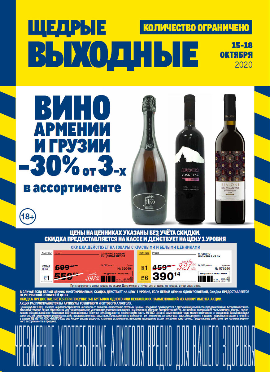 С 15 по 18 октября скидка 30% на вина Грузии и Армении. Скидка традиционно пробивается на кассе при покупке от трех бутылок заданной тематики. Красные ценники в акции участвуют.