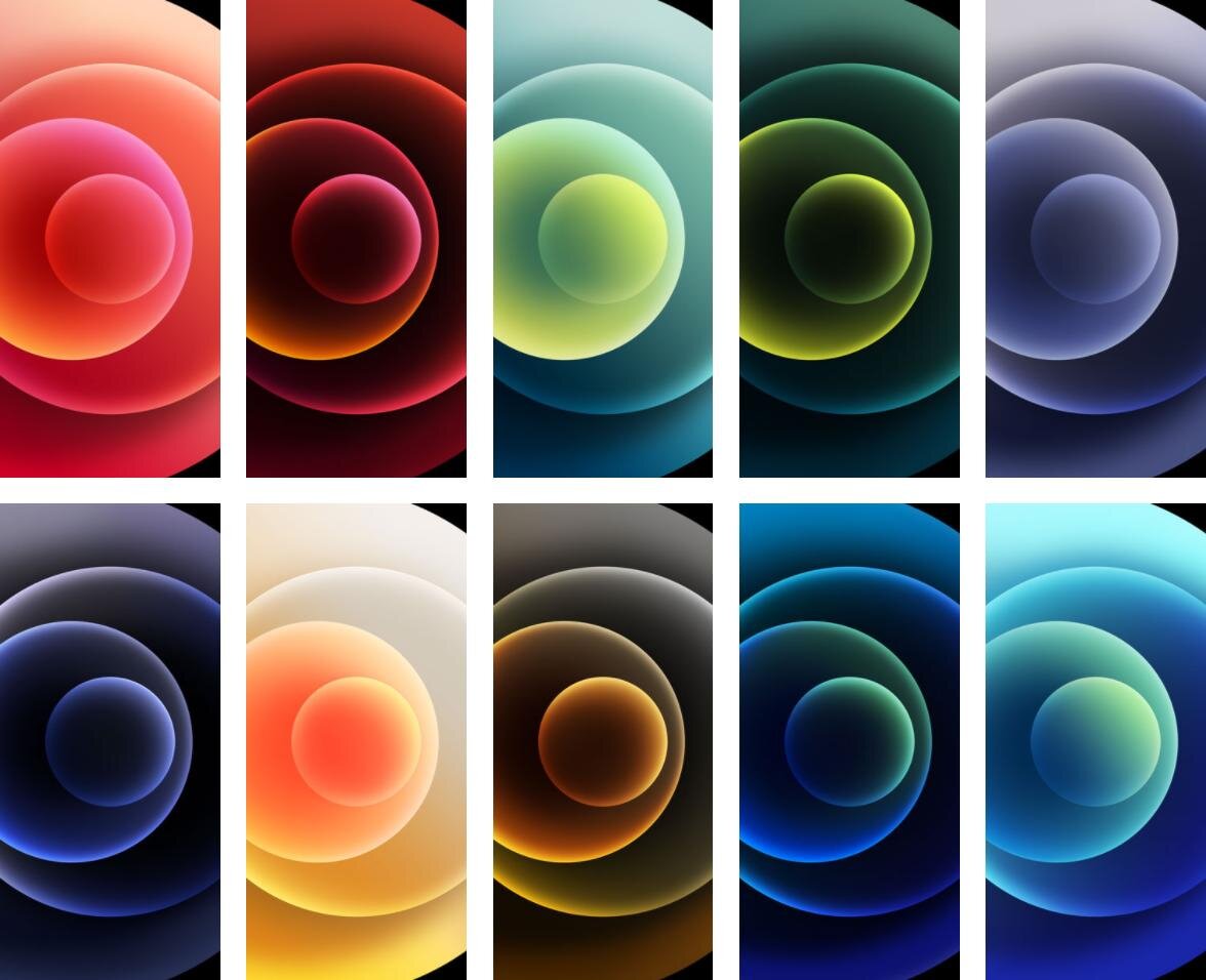 В iPhone 12 и версии mini насчитывают 10 новых изображений со светлыми и тёмными фонами. У модели Max ещё 8 штук, а также имеются живые обои. Все в разрешении не менее 1356×2934 пикселей, подойдут даже для современных гипертрофированных диагоналей аппаратов на Android.