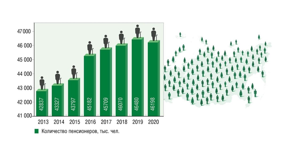 На 1 января 2020 года в стране официально 46 198 000 пенсионеров, что составляет 31,6% от всего населения. На графике мы видим, как росло количество пенсионеров, но по сравнению с прошлым годом их стало меньше на 282 000 человек. Видимо, начинает сказываться пенсионная реформа.