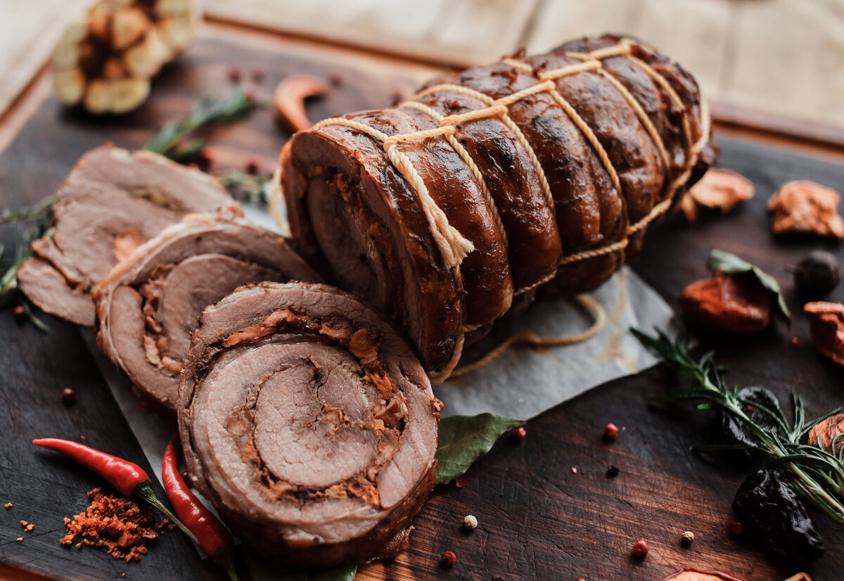 Духовку нагреть до 200С. вместе с духовкой необходимо нагреть и форму в которой будите выпекать рулет.В нагретую форму положить масло, в форму уложить рулет,поставить в духовку на 20-30 мин,во время приготовления необходимо вынимать рулет и поливать его тем соусом который образовался в форме.После уменьшить нагрев в духовке и оставить рулет на 10-15 минут. Дать остыть рулету и убрать шпагат.