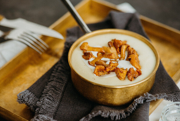 10. Выложить порцию пюре на тарелку. Сделать в пюре ямку и выложить туда горстку лисичек.