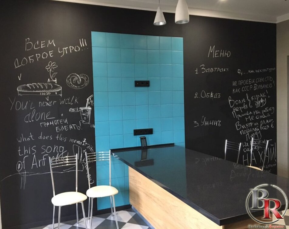 Школьная доска в интерьере ― очень модный элемент. Эта вещь может разносторонне использоваться, а также выступать декоративным предметом, поэтому можно повесить ее в каждой комнате дома. Используйте такую доску для написания сообщений, заметок, рецептов и списка продуктов, нарисуйте на ней что-нибудь красивое. Дети также могут проявить творческие способности, весело проводя за ней время. Убедитесь, что стена, на которую вы хотите повесить грифельную доску, правильно зашкурена. Мел чувствителен к каждому маленькому бугорку, поэтому стена должна быть гладкой.