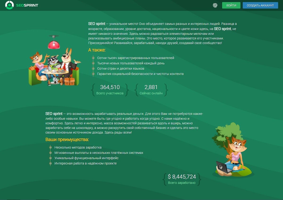 Сегодня мы поговорим о заработке на сайте SeoSprint. Как пользователь я вам скажу что в день я зарабатываю не мало и не много, где то 100-1000 рублей в день. Ну а теперь я расскажу что он из себя представляет:SEO sprint — это площадка где можно зарабатывать на серфинге сайтов, выполнения разных заданий, например зарегистрироваться где-нибудь, а также он хорош для рекламодателей потому, что подписываются или ставят лайки не боты а люди. Перейдем к делу: