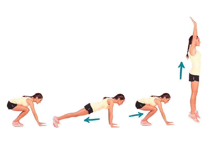 Техника выполнения довольна проста: из положения стоя быстро присядьте, после чего так же быстро примите упор лежа. Теперь в прыжке подтяните колени к груди и выпрыгните максимально высоко вверх, сделав хлопок руками над головой. Повторяйте упражнение не менее 5 раз без остановок.