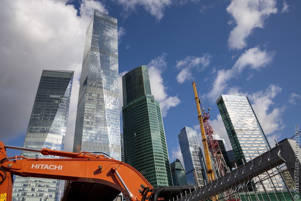 Вторник на дворе... А это значит, что пришло время для поста в рамках фото-проекта "архитектура по вторникам"... Москва-Сити... Давно собираюсь опубликовать свои фотографии этого, безусловно заметного и интересного места. Да всё руки не доходят. Сначала было желание снять со множества ракурсов и сделать большой пост. А после понял, что так я буду откладывать пост с фотографиями небоскрёбов бесконечное количество раз и так и не опубликую… Посему решил не копать архивы, а просто опубликовать сегодня 3 фото, снятых в субботу 19 сентября. Утром была переменная облачность и довольно яркое солнце, что дало снять такие сочные кадры. Даже и не скажешь, что это осеннее небо! Однако ширины объектива оказалось недостаточно, чтобы заснять одним кадром целиком. Да и стройплощадка соединительной ветки Киевского и Смоленского направления железной дороги, находится довольно близко от объекта съёмки. Для полного охвата пришлось снять 4 вертикальных кадра, а из них уже собрать панораму, обрезать лишнее