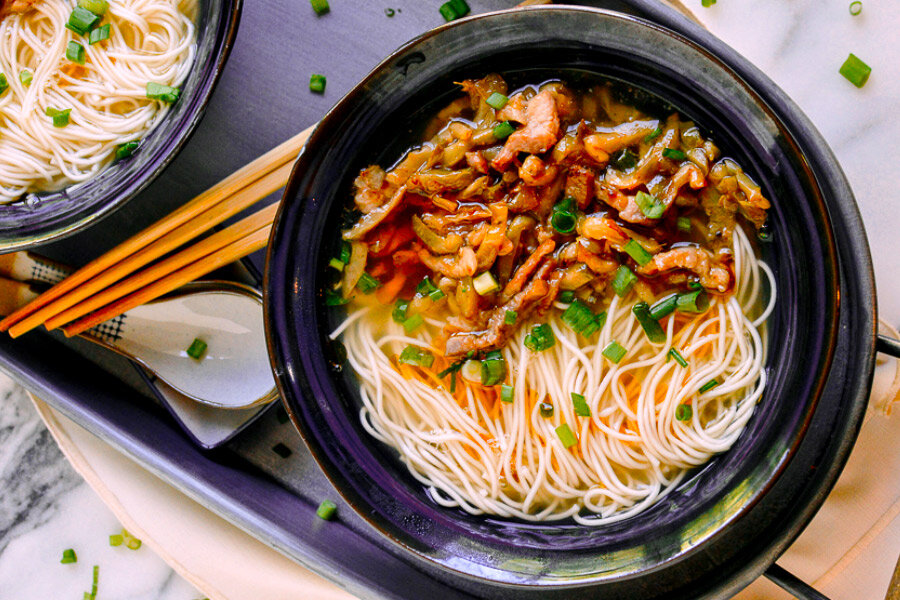 - Вылейте горячий бульон в миски с лапшой и добавьте обжаренную свинину с горчицей. Сбрызните кунжутным маслом и посыпьте зеленым луком. Готово.