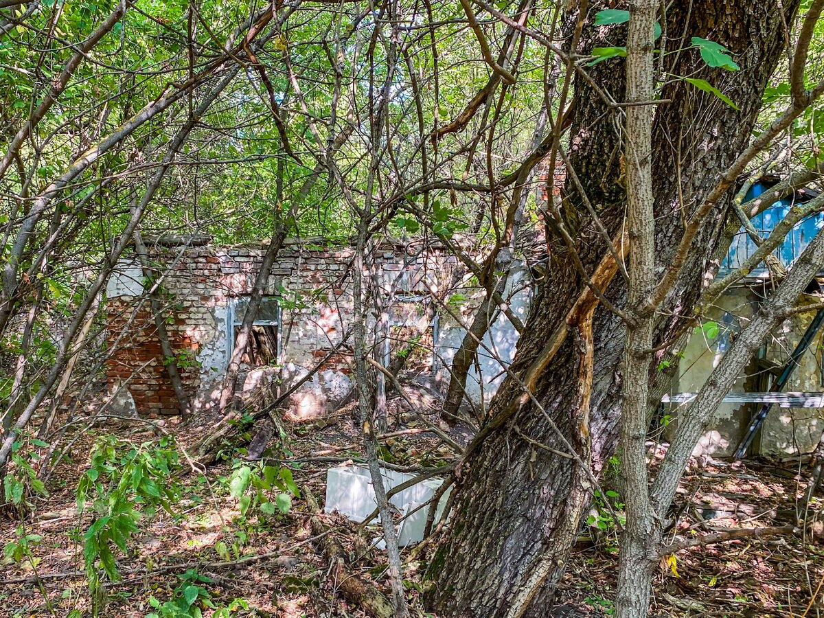 Сохранилась лишь только кирпичная труба, которая уходила на крышу. Крыша уже полностью обрушилась, а труба пока еще стоит.