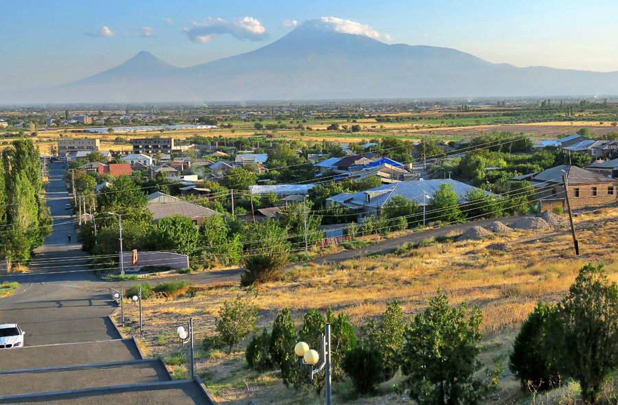 С Ереванского Мусадага открывается один из лучших видов на Арарат. Левее раскинулся город: