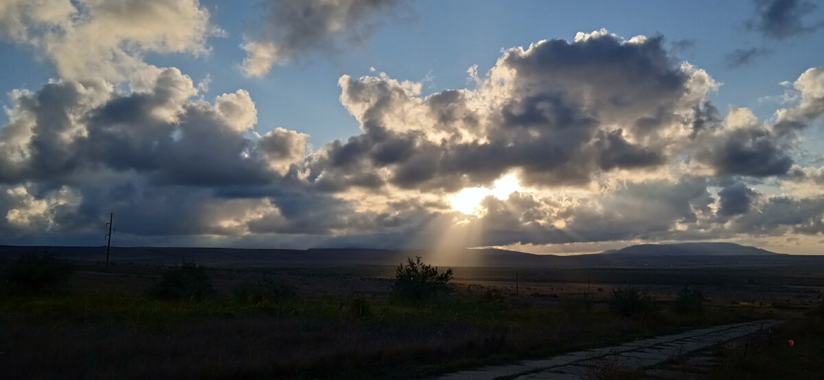 Немного правее за вывеской, на горизонте, виднеется силуэт круглой лесистой вершины горы Святая, это самая большая вершина в горной цепи Кара-Дага. Ее высота составляет 576 метров над уровнем моря.