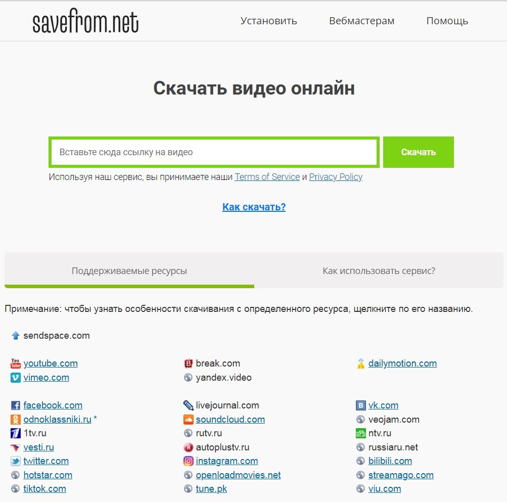 2. Заходим на сайт Savefrom.net, вставляем ссылку на веб-страницу в специальную строку и нажмем Скачать.