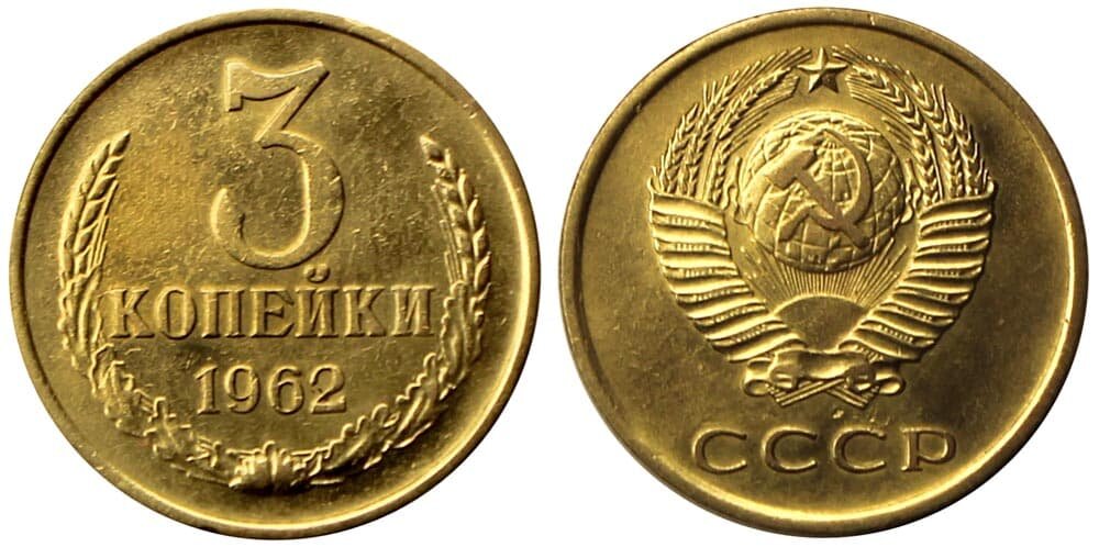 Федорина 3 копейки 1962 года, Л. ст. шт. 2.1 (идентичен шт. 1.1 20 копеек 1958 г.) Ф-76 - справа от звезды внешняя гребенка остей с уступом, поверхность витков ленты уплощена, зазоры между витками ленты узкие.