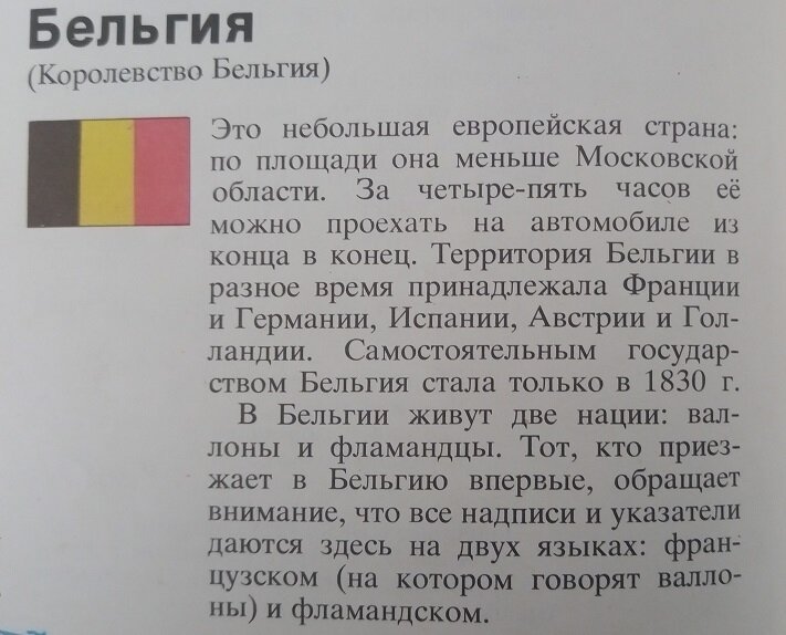 Это небольшая европейская страна: по площади она меньше Московской области. За четыре-пять часов её можно проехать на автомобиле из конца в конец. Территория Бельгии в разное время принадлежала Франции, Германии, Испании, Австрии и Голландии. Самостоятельным государством Бельгия стала только в 1830 г.