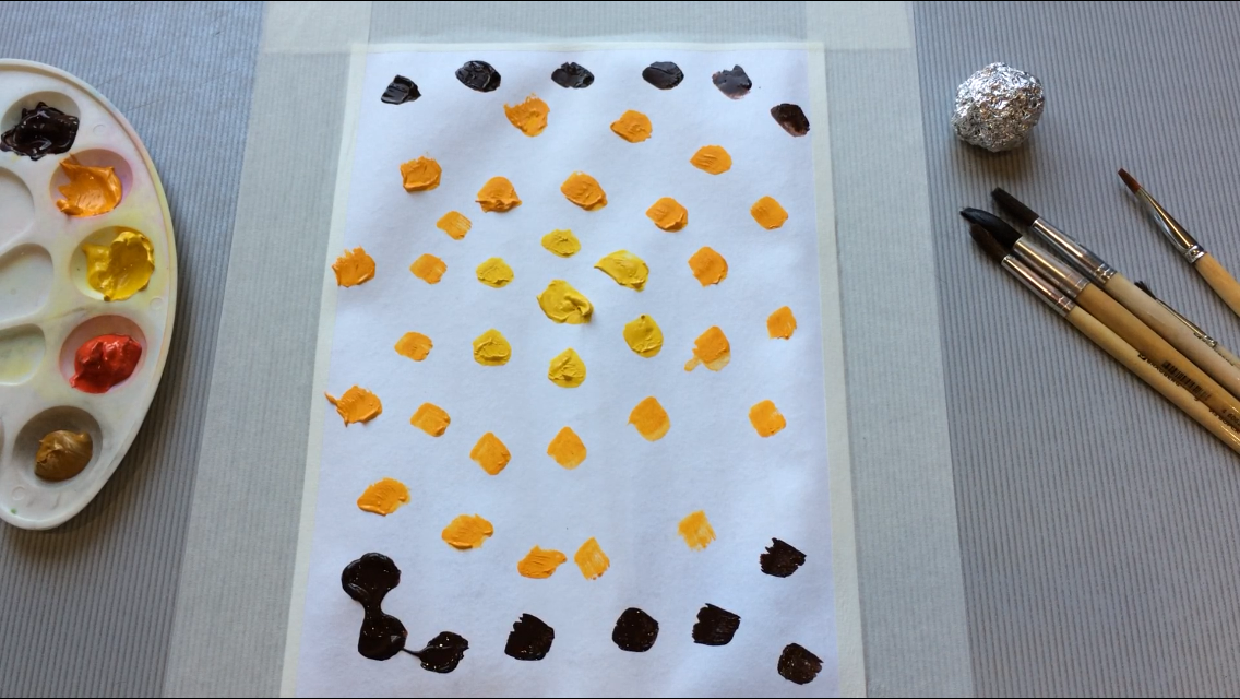 1. расположите точки краски, начиная с желтой, от центра по кругу. Внутри у меня 7 точек желтой краски, дальше идет темно желтая краска, сверху и снизу коричневая.