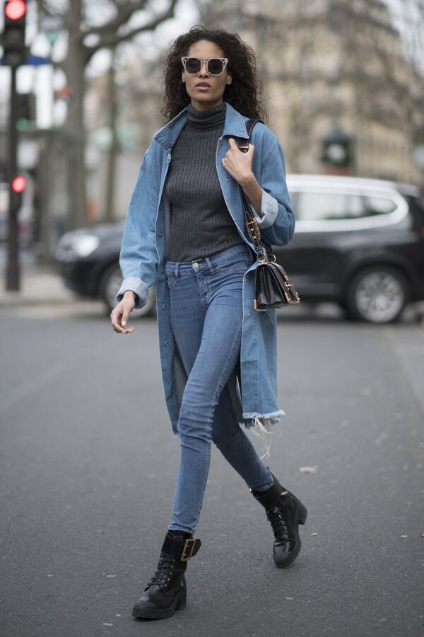 Тандем джинсового плаща и джинсов-скинни не устает покорять сердца современных модниц. Для нарядов в уличном стиле идеально подойдет монохромный верх, это может быть свободный свитер, пуловер или теплая водолазка. В отличие от тренча у джинсового плаща нет «погон», пояс также может отсутствовать.