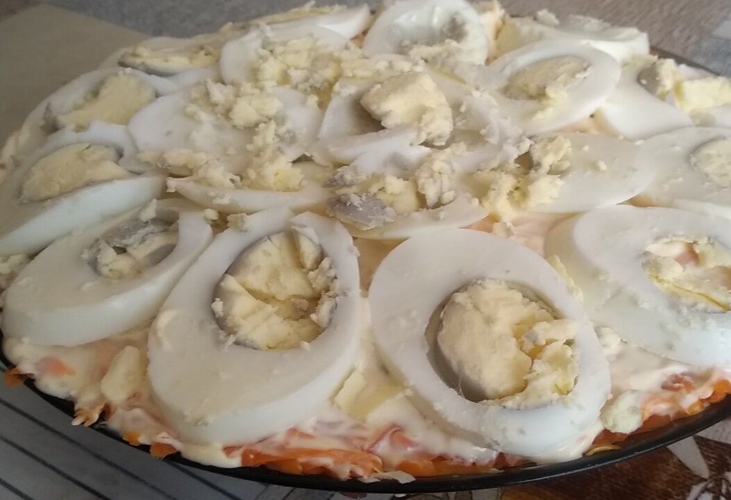 Минимум затрат, а вкусно! Этот слоённый салат - палочка выручалочка. Готовится быстро из продуктов которые всегда есть дома, как говорится под рукой. Можно подать на праздничный стол," уходит на ура", и сытный.