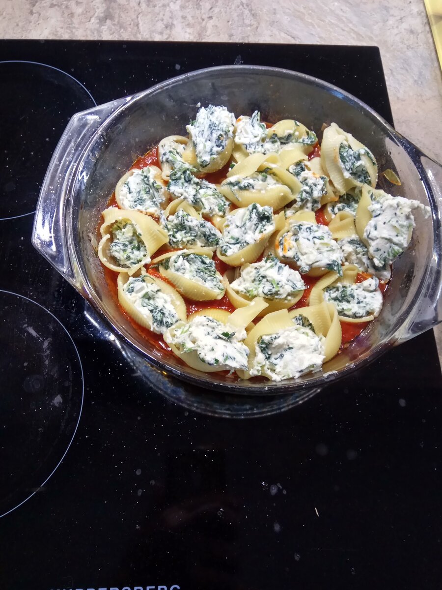 11. Когда все рожки будут нафаршированы, выкладываем их поверх соуса открытой стороной вверх. Накрываем крышкой и тушим в течении 10 минут.