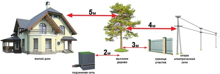 Низкорослое дерево можно посадить в одном метре от внешнего забора, высокорослое — в двух. Нельзя сажать яблоню вплотную к постройкам. Высокорослые и среднерослые сорта лучше разместить в 5–8 метрах от дома или сарая, низкорослые — не ближе 4–5 метров. Расстояние от яблони до теплицы должно быть не менее трёх метров. Необходимо также учитывать и инженерные коммуникации на приусадебном участке и рядом с ним.