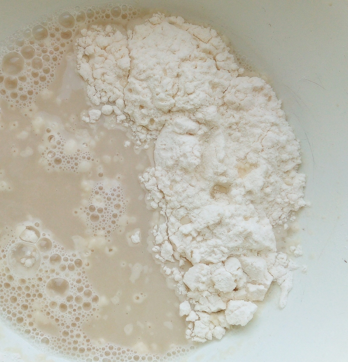 На первом этапе приготовим опару, для чего в подогретой фильтрованной воде соединяем соль, гранулы дрожжей и мелкий белый сахар. Затем вилкой или металлическим венчиком смешиваем ингредиенты и, когда все комочки «уйдут», вводим половину стакана просеянной муки.
