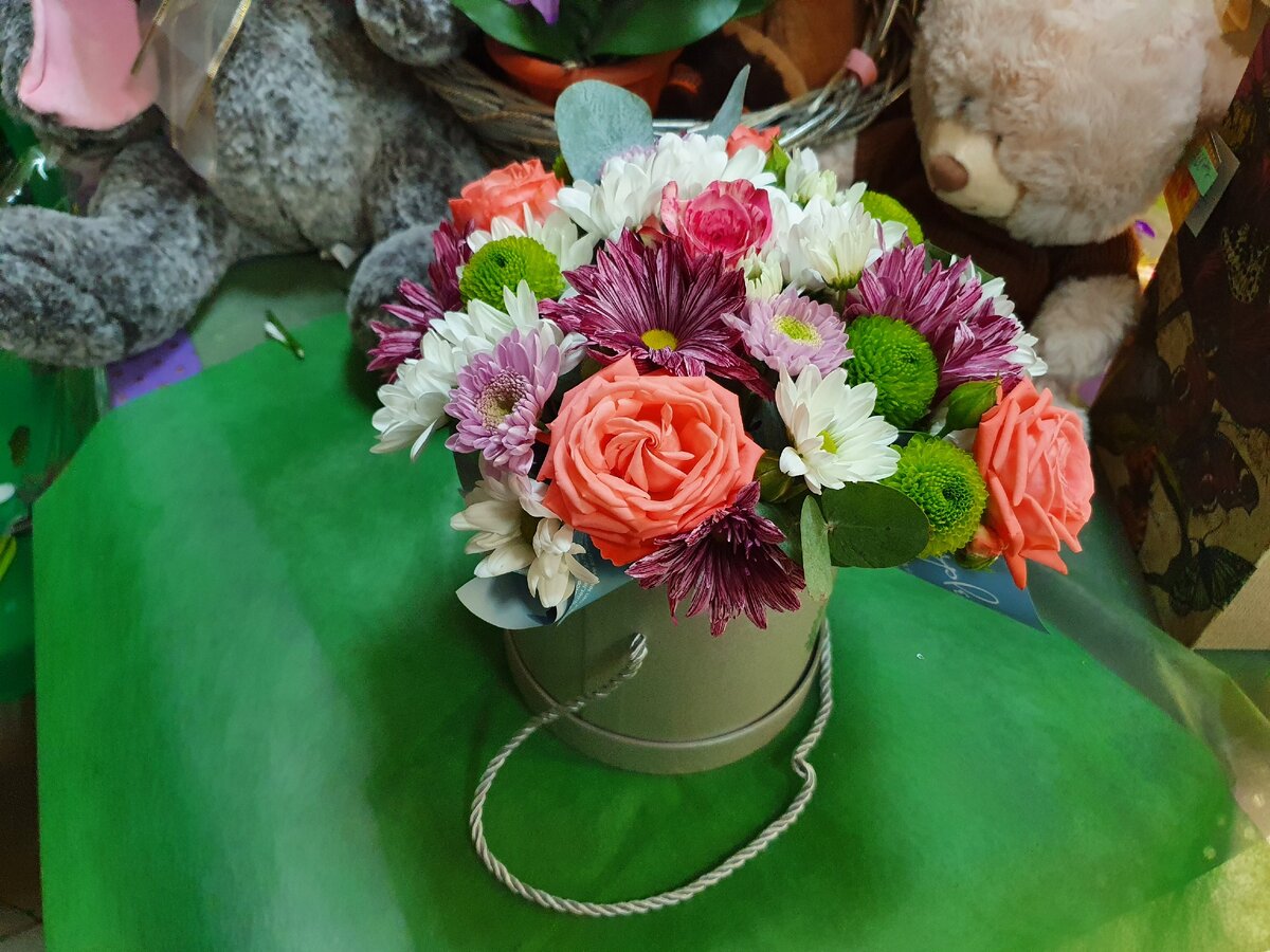 Теперь начинается самая интересная, творческая часть процесса, мы под углом подрезаем цветы и равномерно распределяем по площади, незабываем про зелень с ней букет будет более пышным. Следите, чтобы стебли не упирались в дно коробки, иначе они не смогут впитывать воду.