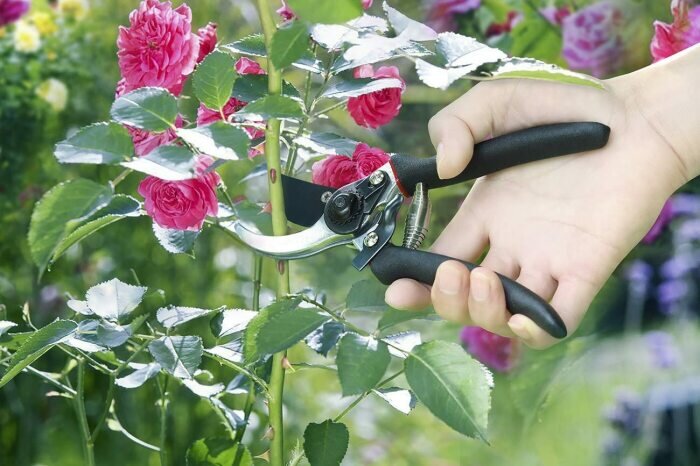 Основа правильной обрезки роз — выбор подходящего инвентаря. Для этого ответственного занятия лучше выбрать пару прочных длинных перчаток, которые надежно защитят руки от шипов, а также качественный секатор, желательно с удлиненными ручками.
