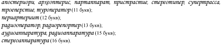 AHAXOPETCTBO, BEPXOBEHCTBO, OPKECTPAHTKA, OPKECTPOTEKA, OPHAMEHTOBKA, OCTEOCAPKOMA, OTBETCTBEHHO, CBEPXOPKECTP, CBOEBPEMEHHO, CEKPETAPCTBO, CKBATTEPCTBO, COPOKABATTKA, CTAPOBEPCTBO (12 букв);
