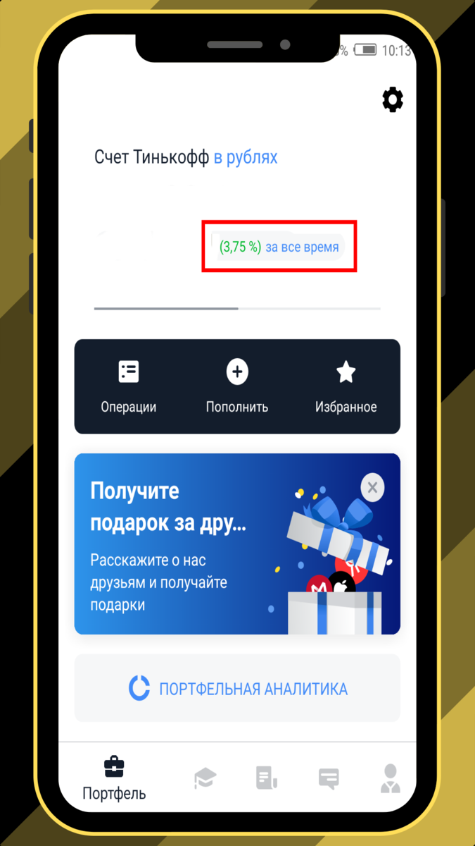 В приложении, на основной вкладке, мы можем увидеть сумму на счёте (суммарная стоимость всех активов в данный момент) и под ней - доходность.