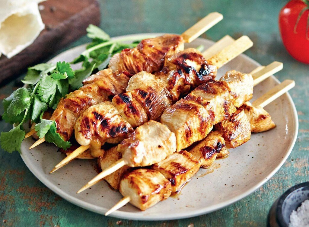 4. На шпажки нанизываем курицу и ананас. Оставшийся маринад не выливаем!