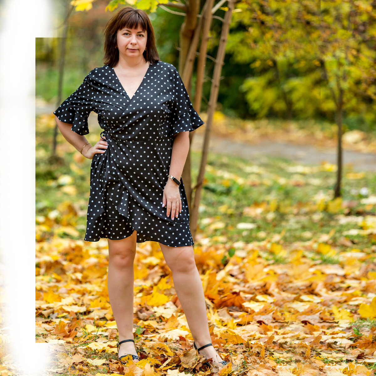 Платье на запАх, образует вырез треугольной формы. В процессе носки вырез не распахивается, держится за счет тонкого пояска, которым мы фиксируем запАх. Пройма достаточно широкая. Рукавчки декорированы оборкой. Линия талии отрезная.