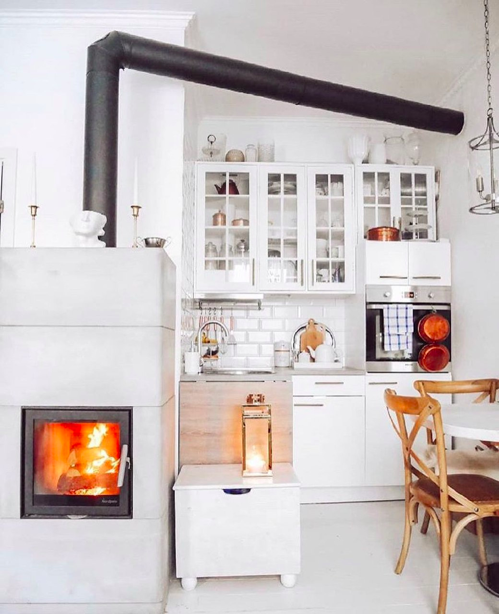 Крохотную 23-метровую таллинскую квартиру переделывала (и постоянно изменяет, но об этом позже) её хозяйка, Liisi Väli. К сожалению, у нас нет фотографий «до», но результат, который она получила, использовав по максимуму все возможности такого небольшого пространства, очень впечатляет. Получилась настоящая дизайнерская квартира, наполненная интересными и эффектными, но при этом полностью функциональными вещами, которые хозяйка использует так же полно, как и каждый квадратный метр своего жилья. Задумываетесь о том, чтобы обновить интерьер? На Mebel.ru найдутся варианты, рассчитанные на любой бюджет. Переходите и выбирайте! Основной цвет этого интерьера – белый, и яркие, сочные тона мебели и декора выглядят на этом фоне особенно привлекательно. Особенности планировки Лийзи превратила в достоинство и эффектную особенность – к кухне примыкает камин. Интересная деталь: варочной поверхности на этой кухне нет, – видимо, её функции переданы духовому шкафу. Прихожая совсем небольшая, но не мене