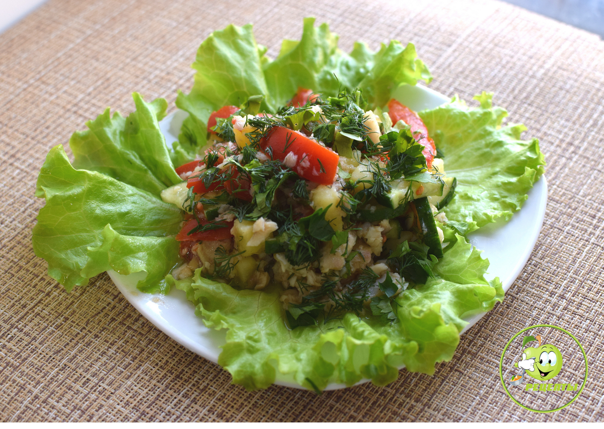 Рецепт этого салата я нашла в старой кулинарной книге. Он заправляется салатной заправкой, это смесь растительного масла, уксуса, соли, сахара и черного молотого перца. В книге предлагается даже сделать эту смесь впрок объемом 500 мл, налить в бутылку и использовать по мере надобности для заправки салатов.