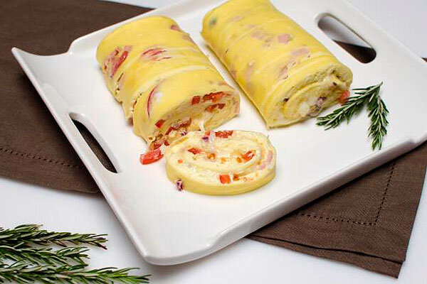5.Готовый омлет с беконом переложите из духовки и заверните в рулет. Придержите руками минуту, чтобы сыр слегка остыл и таким способом зафиксировать форму.