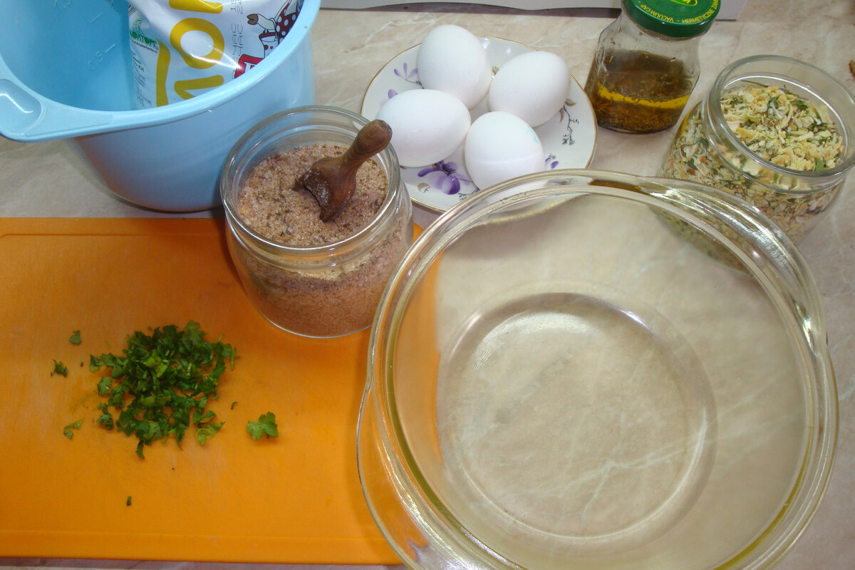 — соль, специи. Поехали. Всё просто. В миску разбиваем яйца, туда же соль, специи, зелень. И взбиваем - хоть венчиком, хоть вилкой. Я проводила исследование на эту тему, особой разницы нет. А вот текст вышел забавный, рекомендую. :) Взбили и смотрим: какой уровень у смеси? А потому что молока надо налить столько же! Вот тут весьма наглядно видно, как вырос отмеченный уровень. Теперь нужна огнеупорная посудина. У меня - стеклянная кастрюлька.