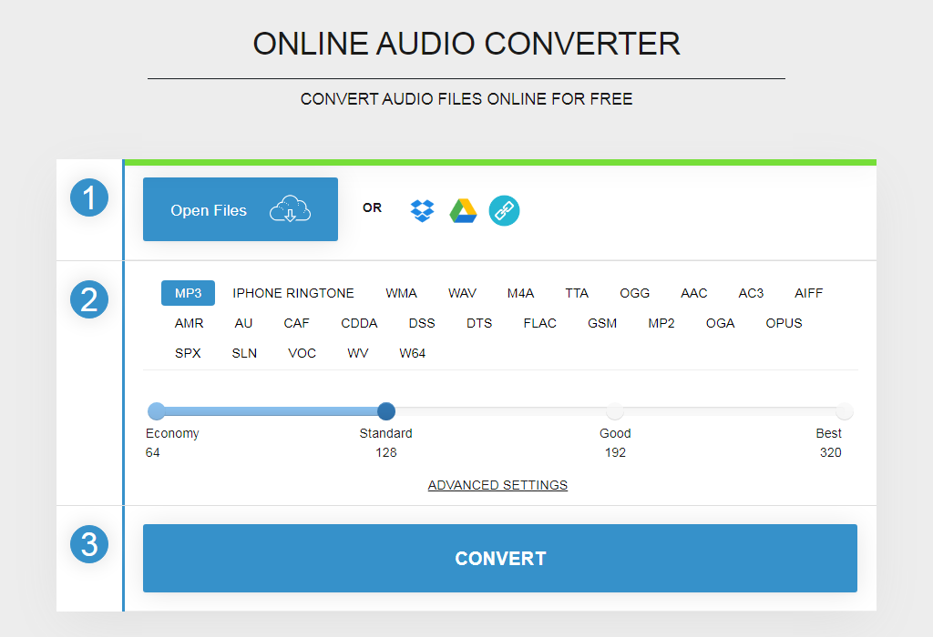 Для выбора необходимого для преобразования аудиофайла, необходимо загрузить его с личного компьютера, из Dropbox или же воспользоваться Гугл Диском, выбрав соответствующие иконки на экране. Далее необходимо выбрать подходящий формат, в котором будут преобразованные данные.