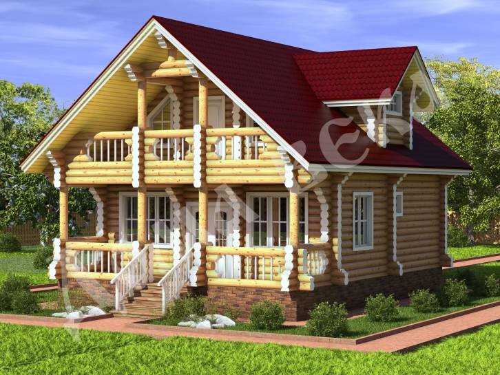 Типовой дом из бревна, 2 этажа. Рассчитан на строительство из ОЦБ крупного диаметра (возможен выбор диаметра материала от 200 до 300 мм, с шагом в 20 мм). Размеры первого этажа — 7,5х11,5 м, второго — 7,5х10 м.Вход в здание через крыльцо 2,3 м2 и крытую террасу 12,95 м2.